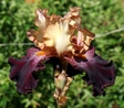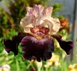 за білими стандартами світло-коричнево-золоті розводи, чітко виражені жилки винного кольору, фоли оксамитові фіолетово-чорні, борода оточена білим промінням; бороди в основі фіолетові з помаранчевими волосками.